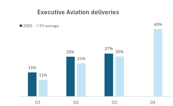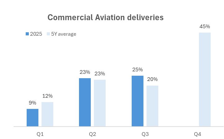 In 3Q25, the business unit delivered 20 new aircraft, 4 more than the 16 delivered in 3Q24. Consequently, during the 9M25, deliveries totaled 46 aircraft or 57% of the midpoint of the full year guidance (between 77 and 85 in 2025), 2 percentage points above the 55% average recorded for the period over the past 5 years. Looking forward, we expect more tangible results from our production leveling initiative in 2026.