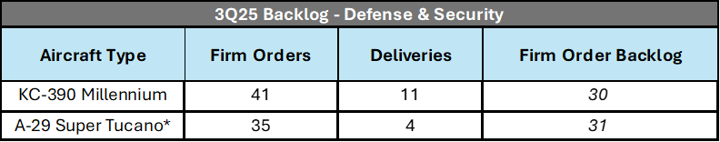 · Defense & Security delivered one KC-390 Millennium to the Portuguese Air Force, and sold 5 A-29 Super Tucano units to Panama and SNC