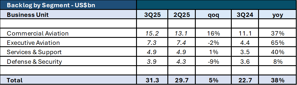 Embraer’s backlog reached US$31.3 billion in 3Q25 – an unprecedented high!
