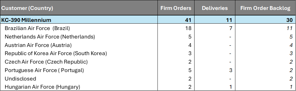 In August 2025, aligned with Embraer's strategic objective of increasing near-term aircraft availability for international customers, Embraer and the Brazilian Air Force entered into a mutual agreement to reduce the total number of KC-390 aircraft to be delivered under the existing contract from 19 to 18 units.