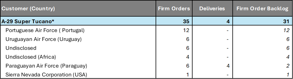 *Includes only A-29 Super Tucano ordered since 2024. A total of 264 aircraft has been delivered through 2023.