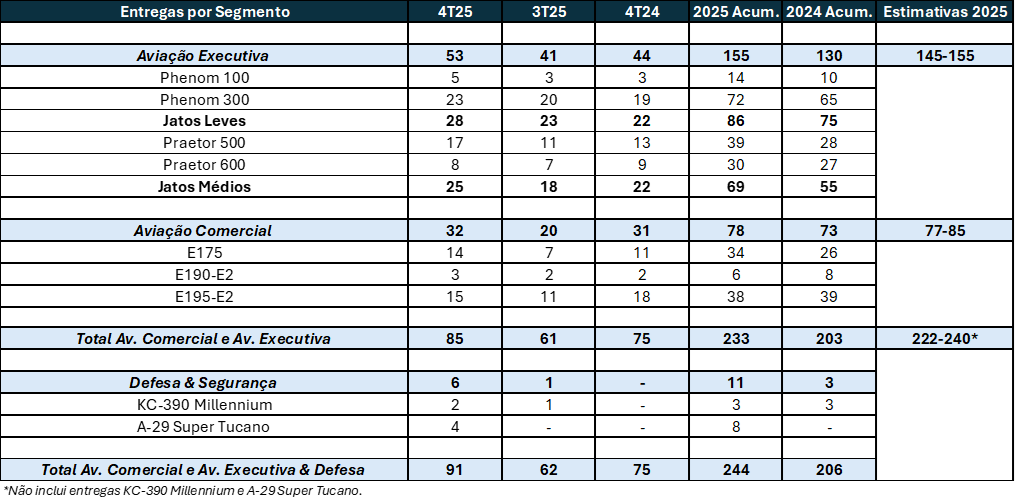 São Paulo (SP), 6 de janeiro de 2026 – A Embraer (B3: EMBJ3 / NYSE: EMBJ), uma das líderes globais da indústria aeroespacial, entregou 91 aeronaves no 4T25. O resultado foi superior aos do 3T25 e 4T24, quando as entregas somaram 62 e 75 aeronaves, respectivamente.